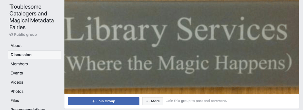 Lucy, one of my classmates, is a kind human being who shared this Facebook group with Natalia and I to help us as we navigate the world of cataloging.